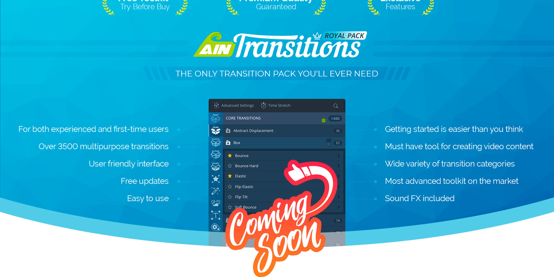 For your peace of mind, you’ll be glad to know AinTransitions is future proof, meaning you’ll receive regular and necessary updates, to guarantee it always runs smoothly with your Adobe editing software.